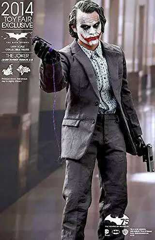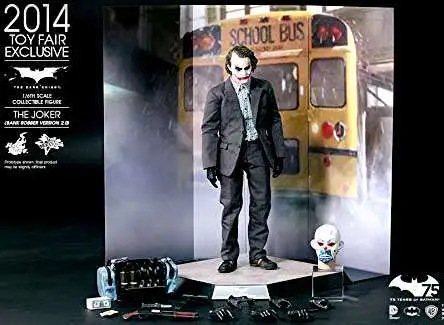 The movie-accurate Toy Fair Exclusive item is specially crafted based on Heath Ledger’s image as The Joker in his bank robber outfit. Featuring a newly painted head sculpt with upgraded technique, a newly sculpted interchangeable Bozo masked head sculpt with scuff marks, brand new tailored slimmer-fitting costume, detailed weapons, accessories, and a backdrop of the school bus used in the Gotham National Bank heist.buy = ‘Y’;