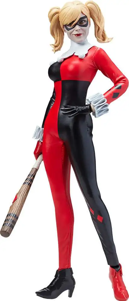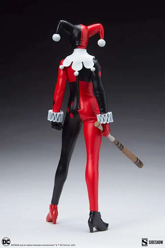 Inspired by her classic comic book appearance, the Harley Quinn Sixth Scale Figure wears a fabric bodysuit costume with black and red paneling, diamond patterns, and sculpted white accents like her collar and wrist cuffs. Harleys grinning portrait features her signature pale complexion beneath a black domino mask and her trademark two-toned jester hood completing her crazed expression.