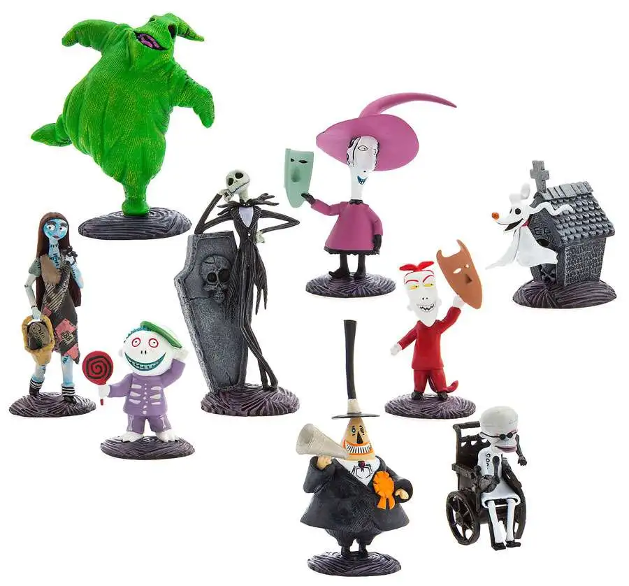 Enter a hallowed world of gothic holiday delights with this deluxe 9-figure play set featuring favorite, fully-sculptured friends and fiends from Tim Burton’s The Nightmare Before Christmas.