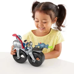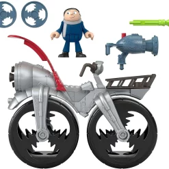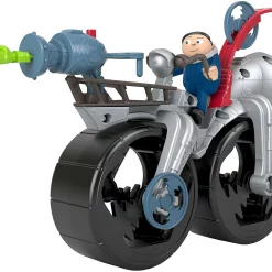 Gru’s Bike sku comes with one figure and one stick projectile and two projectile disks. Press the Imaginext button to shoot the stick projectile. Gru will be held in place by using the handle bars of the motorcycle. Pull back on the catapult to launch the disk projectile. Minion figures (sold separately) will snap into center of the wheels of the bike. The figures will not rotate while the wheel is spinning. bike will roll freely. The disk projectiles will store on the back of the seat and on the center point of the wheel.