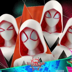 Based on the appearance of Spider Gwen in the movie, the highly-accurate figure features a newly developed head sculpt with incredible likeness of Gwen Stacy, a masked head sculpt with multiple pairs of interchangeable eyepieces to create different expressions, a newly developed body, teal ballet shoes with white, black and pink web patterned suit in meticulous tailoring and great details. The amazingly detailed accessories include a Spider-Ham sixth scale figure sticking out his hand, Spider-Gwens mask, smartphone, mirror case, physics book, assorted web accessories, comic art inspired character backdrop, also a dynamic figure stand for aerial poses.