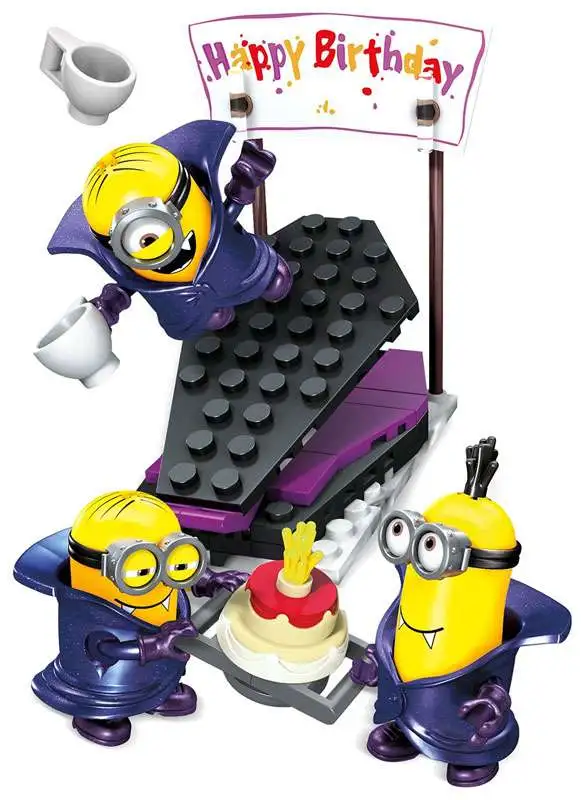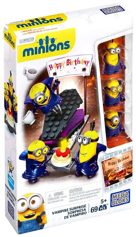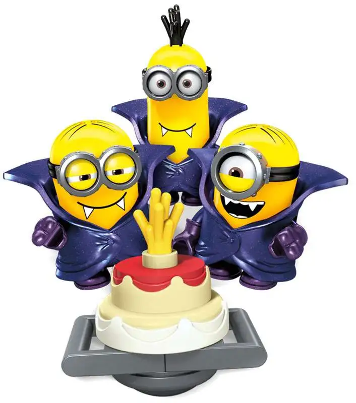 Theres lots for the Minions to sink their teeth into when you build the Vampire Surprise by Mega Bloks Minions! These three Transylvanian troublemakers are planning a fang-tastic celebration, with a special cake topped with fireworks for the occasion! Use the launcher to really bring the party to life, sending Minions and cake flying into the air! The Minions come with interchangeable pieces and accessories, like vampire cloaks, goggles, even arms, feet and hair. Mix and match to customize your Minions for some frightfully fun chaos!