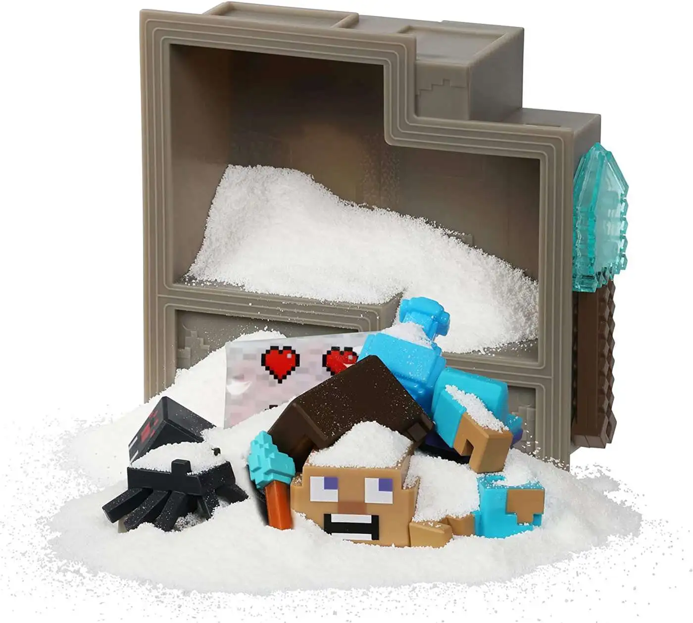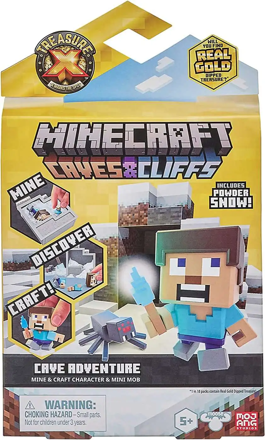 Bring your Minecraft adventure to life as you mine for Characters and REAL Gold Dipped Treasure with Treasure X Minecraft Caves & Cliffs – Cave Adventure! Work your way through the Caves to discover all new Characters, Mini Mobs and Treasure as you take on 16 levels of adventure. Break through the surface with your Shovel. There are so many things to do and see in your search for the REAL Gold Dipped Treasure. Add Water to create an avalanche of Powder Snow! Mine your way through the Snow to discover your hidden Treasure and all the parts you need to craft your Character and Mini Mob. Craft your Characters using the Aqua Stick Hearts for no mess, instant crafting. Discover one of three Character Pairs in each pack. Mine for Explorer Steve and Baby Spider, Wild Wolf and Baby Wolf or Stray and Bat. Your Characters will bond together in 5 minutes simply by using the Aqua Stick and water! Look out for the rare Soul Campfire Treasure! Or will you find the “Golden Clock”? – a REAL GOLD dipped Treasure! There is 1 in 18 chance of finding real Gold Dipped Treasure in the Cave Adventure Pack! Minecraft fans will love to discover, mine and craft. Collect them all!