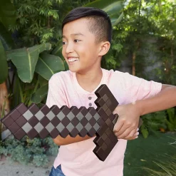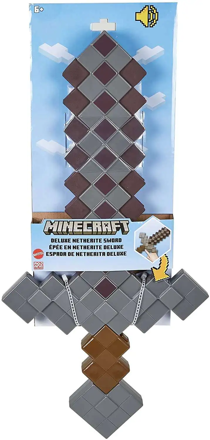 Draw your sword and SWOOSH! CLANK! Minecraft players can battle it out in the real world with this kid-sized Deluxe Netherite Sword set that makes game-authentic sounds. This fan-favorite accessory looks just like the weapon that Minecraft gamers craft to fend off attacks by evil mobs! A built-in accelerometer detects motion and impact, so kids hear a realistic SWOOSH! or CLANK! sound when they wave their weapon during swordplay. Players will have a blast using it to duel their friends offline. A gameplay option keeps track of successful strikes and plays authentic, in-game sounds for an even more immersive experience.