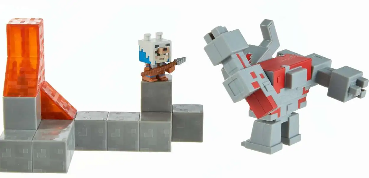 This exciting Minecraft Dungeons-themed Mini Battle Box offers complete play right out of the box. Battle set includes an exclusive 3-in wide Redstone Monstrosity that reaches almost 4 inches tall! This terrifying Minecraft boss mob boasts authentic design details right down to his three yellow eyes. Also included: armored Valorie mini figure. Ever battle ready, she wields a sword and is armed to take on the Redstone Monstrosity! Battle box comes with a lava set piece for even more storytelling options! All kids have to do is add imagination, and they’re well on their way to exploring the new dark world of canyons, swamps, dungeons and mines! It’s an exciting, complete battle-in-a-box set for Minecraft fans.