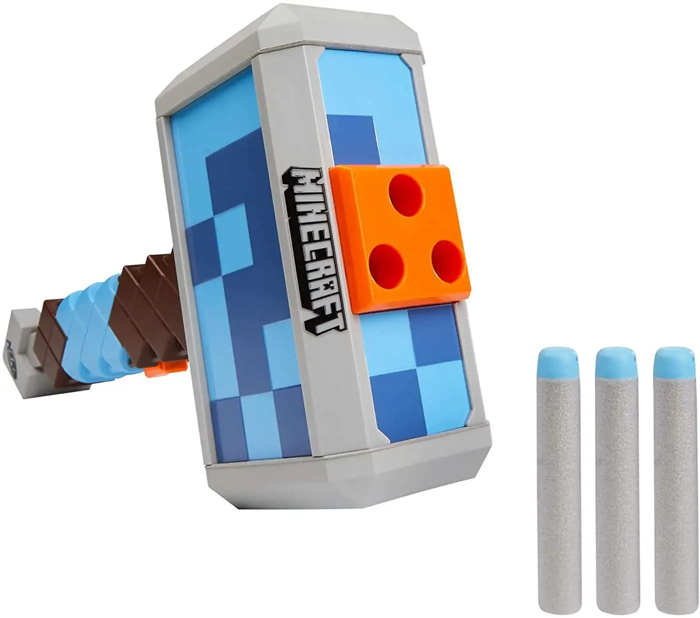 LOAD, PRIME, FIRE: Load 3 darts into the front of the hammer, pull back the priming handle, and press the button to unleash 1 dart from this Minecraft-inspired hammer