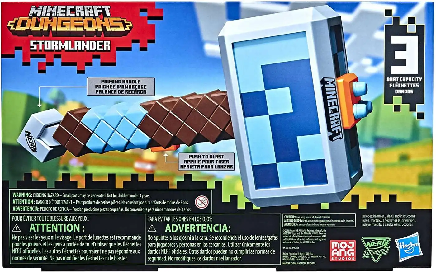 Nerf and Minecraft combine to create distinctive blasters that change the look of battle! The Nerf Minecraft Stormlander hammer takes its inspiration from Minecraft: Dungeons, capturing the look of the hammer from the popular video game. This dart-blasting hammer holds 3 Nerf Elite darts and unleashes them 1 at a time. Load 3 darts in the front of the hammer, pull the priming handle, and press the button to fire 1 dart. The Nerf Minecraft Stormlander hammer includes 3 Official Nerf Elite foam darts that are tested and approved for performance and quality, and are great for indoor and outdoor Nerf battles. Eyewear recommended (not included).
