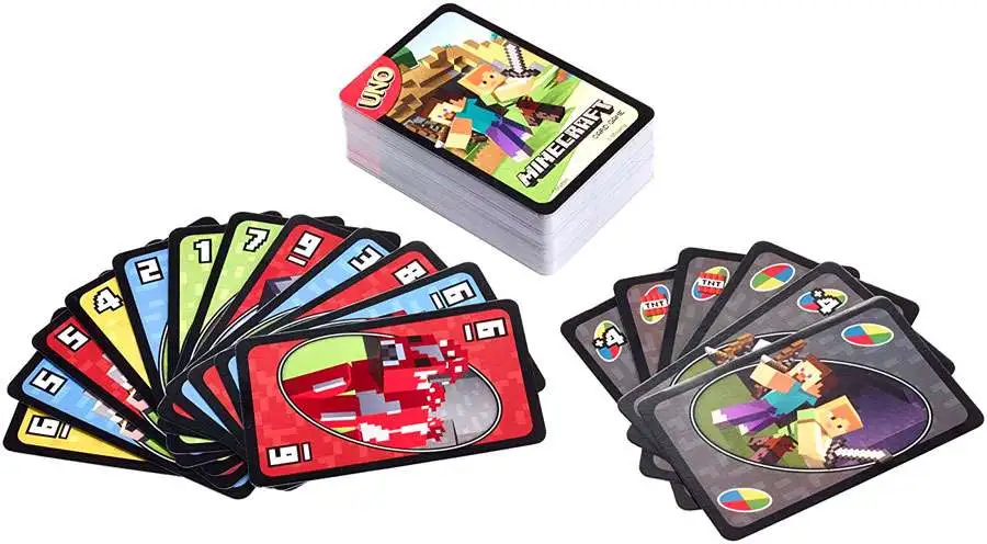 As in the UNO you love, UNO Minecraft gameplay involves players racing to get rid of all their cards, but this version features cards with Minecraft characters and images and a special rule! You want to match a card in your hand with the current card shown on top of the deck, and you’ll score points for the cards your opponents are left holding. And in UNO Minecraft, there’s also a new type of action card; when you draw the Creeper card, show it to the other players and they’ll have to draw three more cards! The first player to reach 500 points wins. When you’re down to one card, don’t forget to yell “UNO!” Contains 112 cards plus instructions. For 2 to 10 players, ages 7 and older. Easy to pick up, impossible to put down. Colors and decorations may vary.
