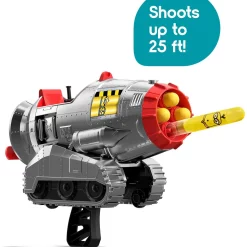 Be as mischievous as the Minions with this two-in-one tank and blaster. Put a 4-inch character figure in the cockpit to commandeer the fun. Then, roll the large “metal” combat tank in pursuit of the enemy. When your target is in sight, fire! You can also change the vehicle into blaster mode and fire again. The Minion Missile holds four included Minion styled darts and shoots them up to 25 feet. Enjoy hours of movie themed mission play with this unique vehicle and blaster. Includes 4 Minions darts. 4-inch action figures sold separately, subject to availability. Colors, decorations and dimensions may vary.