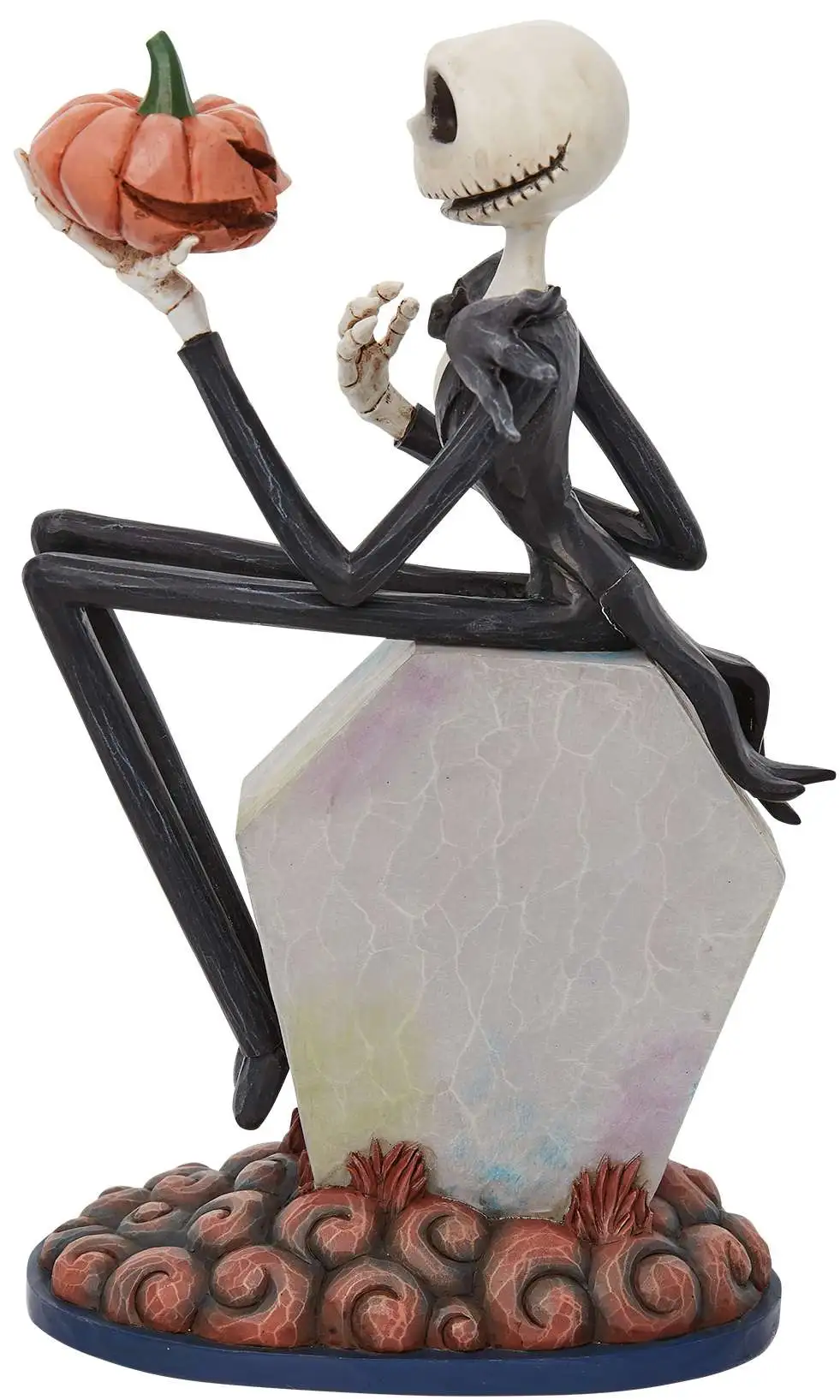From Enesco. Sitting atop a tombstone, Jack Skellington has a To Be Or Not To Be moment with a jack-o-lantern. Eye to eye, he holds a pumpkin much like a skull and contemplates all things Halloween. This Jim Shore piece boasts patchwork details and endless charm. This 8.7″ figure is beautifully hand-painted and crafted from high-quality stone resin with intricate styling and attention to detail.